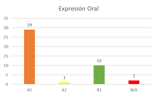Según datos, se puede apreciar que 25 participantes (59.5%), según MCER (2002) conocen estructuras gramaticales bastante sencillas. 11 de ellos tienen la capacidad de utilizar estructuras sencillas con cierta concordancia. 5 de los participantes tienen la capacidad de utilizar un buen repertorio de estructuras gramaticales con razonable corrección.