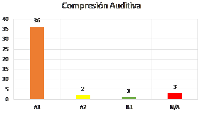 De acuerdo con los resultados de la gráfica, se puede apreciar que 36 participantes (86%) de 42 alcanzaron un nivel de A1, lo cual indica según el MCER (2002) que ellos tienen la capacidad lingüística de comprender discursos lentos y pausados para poder asimilar su significado. Los niveles A2 y B1 muestran que hubo un nivel muy bajo en los desempeños. Se puede concluir según datos de la gráfica que el 85% de los participantes están ubicados en A1, lo cual indica que ellos comprenden aquellos discursos que son articulados con mucho cuidado y con suficientes pausas. Conforme a los resultados, se puede apreciar que son pocos los participantes que poseen una comprensión auditiva más allá de lo que se considera nivel básico según descriptores.