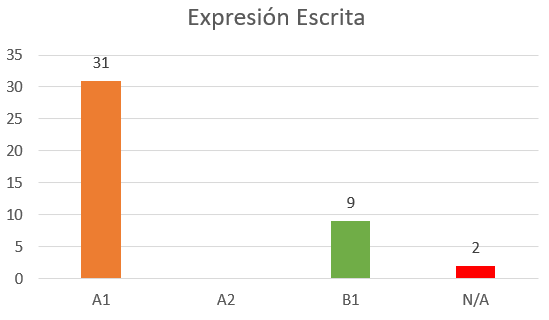 De acuerdo con los datos, 31 participantes (74%) tienen la capacidad de escribir frases y oraciones sencillas (MCER, 2002), y 9 de los participantes (21%) obtuvieron el máximo nivel B1, lo cual indica que ellos tienen la capacidad de escribir textos sencillos y cohesionados sobre textos cotidianos. Se puede concluir que los participantes poseen conocimientos muy básicos sobre la expresión escrita.