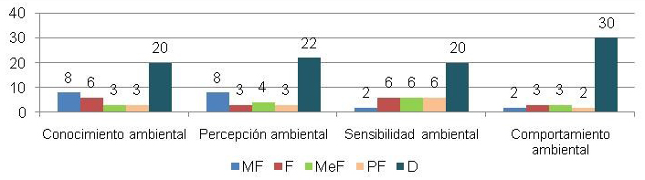 El estado de la educación ambiental que evidenciaron los estudiantes después de la aplicación de la estrategia, fue el siguiente. De 40 estudiantes, ninguno estuvo Desfavorable; el 17,5% fue Poco Favorable (7 estudiantes); el 12,5% fue Medianamente Favorable (5 estudiantes); el 32,5% fue Favorable (13 estudiantes), y un 12,5% fue Muy Favorable (5 estudiantes). Como se puede apreciar, aunque todavía se debe continuar tratando la educación ambiental debido a las insuficiencias que presentan algunos estudiantes, existió un mejoramiento en su desempeño, lo cual demuestra avances significativos.