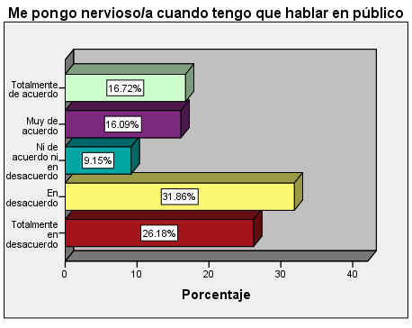 El 26.18% y el 31.66% responden estar totalmente en desacuerdo y en desacuerdo respectivamente en que no se ponen nervioso/a al hablar en público, pero no se puede obviar que el 32.81% no controla su emoción al hablar en público poniéndose nervioso/a.