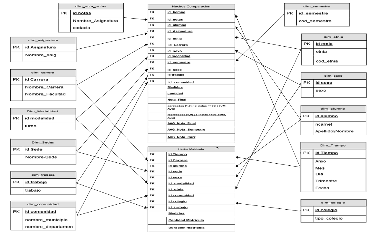 Para la creación del diseño lógico; primeramente, se describieron las dimensiones y hechos (Tabla 2), son los que permiten obtener información detallada o agrupada, como también realizar comparación con respecto a las calificaciones de los alumnos; seguidamente, se realizaron las relaciones entre las distintas dimensiones y tablas de hecho (Ilustración 3), se utilizó el modelo de tablas en estrella.