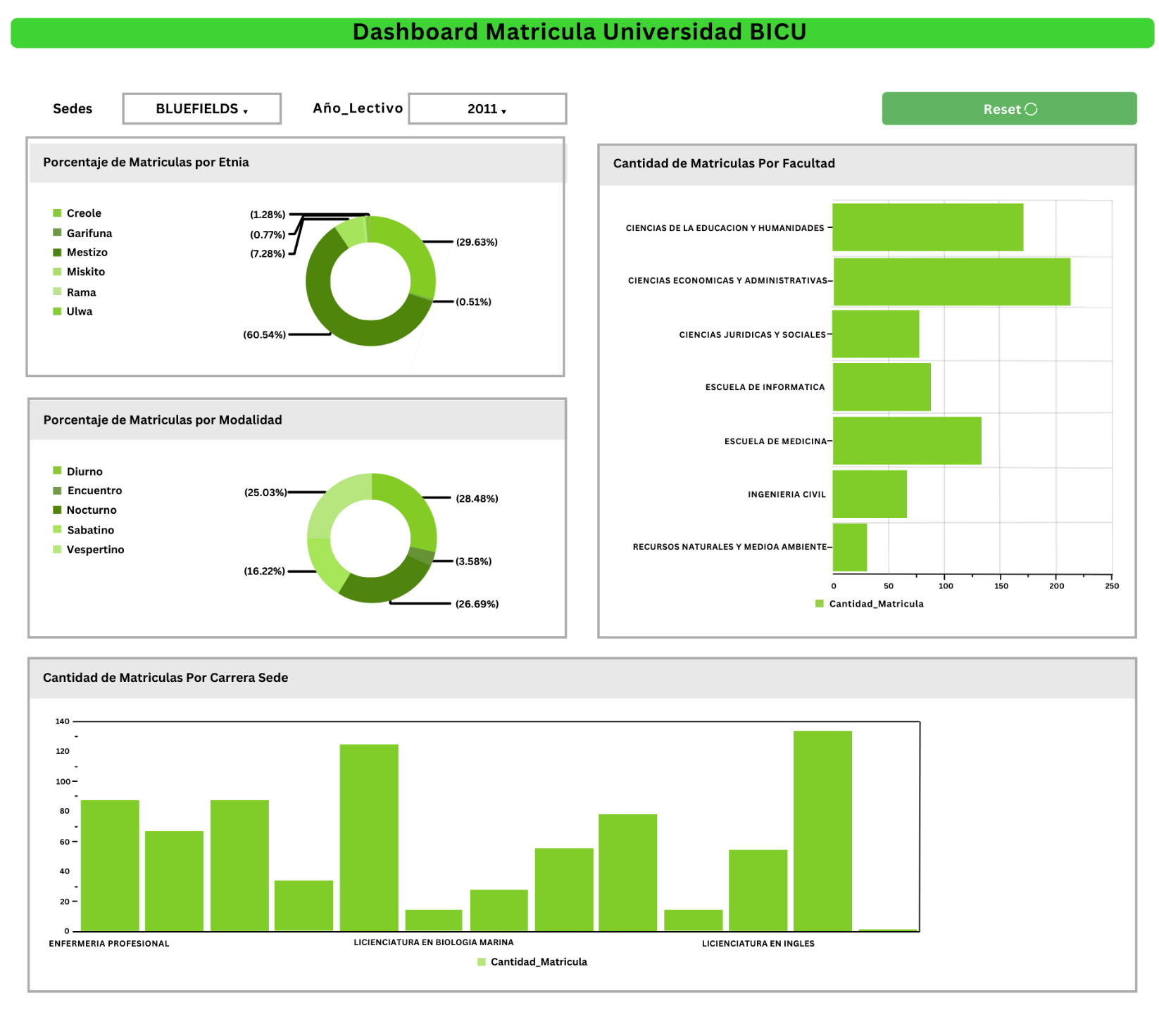 Lo antes mencionado, sugiere continuidad en el proyecto de forma que, se logre una herramienta más pertinente al contexto de BICU, entre las consideradas están: incorporar modelos de predicción para predecir si el historial académico previa a la universidad, localización de procedencia, etnia o sexo influye en el desempeño académico del aprendiente, personalizar el entorno grafico a uno más representativo de la universidad con sus logos y colores institucionales, crear otras consultas y cuadro de mando que pueden ayudar a encontrar otros patrones ocultos en la información académica, incluir los datos de las sedes faltantes de Waspan, Bilwi, Bonanza, Paiwas y Perl Lagoon, lo que permitirá tener información más completa, y las decisiones se podrán tomar desde una perspectiva mas holística.