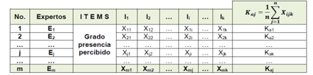 Se entregó el cuestionario a los especialistas, con el objetivo de conocer el grado de conocimiento sobre el tema en cuestión. De acuerdo con los ítems que se le presentaron y la escala correspondiente, se marcó (X) en la casilla pertinente. La escala es ordinal donde 1 es el nivel más bajo y 10 es el más alto (tabla 1). Con los resultados del instrumento aplicado se calcula el valor del coeficiente, como se muestra la tabla 2.