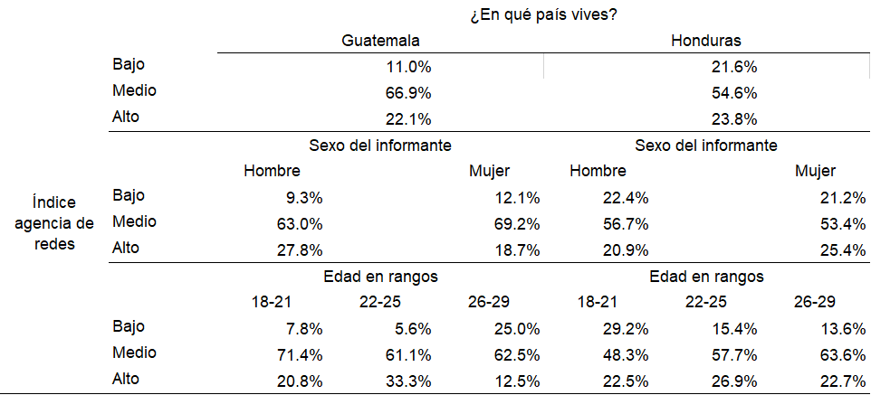 El Índice de agencia de redes, entendido como la capacidad de comunicarse y de cooperar con otros por medios virtuales como el internet, se puede clasificar como un índice con nivel medio en ambos países, sin embargo, en Guatemala hay un 11.0 % que se clasifican como de bajo nivel en este índice, diez puntos porcentuales debajo de lo que muestra en Honduras, en tanto que, en el nivel medio, los guatemaltecos tienen 66.9%, doce puntos porcentuales por arriba de los hondureños. El nivel alto es similar en ambos países (Tabla 3).