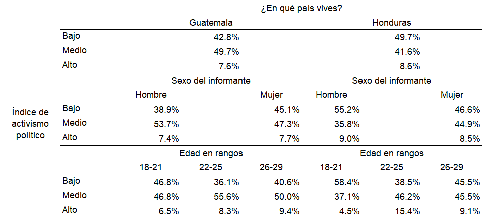 Además, en Guatemala, entre más jóvenes es mayor el porcentaje de nivel bajo de participación electoral. El nivel medio es mayor por parte de los jóvenes de 22-25 años y en el nivel alto son ligeramente superior los de 26-29 años. En Honduras es similar el patrón, pero en mayor magnitud, por ejemplo, siguen los más jóvenes como los de mayor apatía electoral, seis de cada diez aproximadamente tienen un nivel bajo de activismo político, veinte puntos porcentuales mayor que sus pares de 22-25 años. Es importante mencionar que este último grupo de edad tienen el porcentaje mayor de participación de nivel alto.