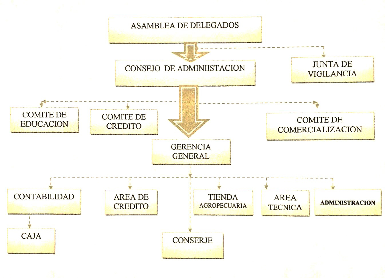 La estructura organizacional de la cooperativa está conformada por una asamblea general de productores asociados. A partir del 22 de mayo del 2004 se deciden reunirse en asamblea por delegados, que son elegidos por sector, por cada 10 asociados se elige un delegado. Para elegir un delegado debe existir al menos 5 asociados, caso contrario estos deben unirse a otro sector aledaño. De estos delegados se eligen los miembros de los diferentes órganos de gestión: Consejo Administrativo, Junta de Vigilancia y Responsable de Comercialización.