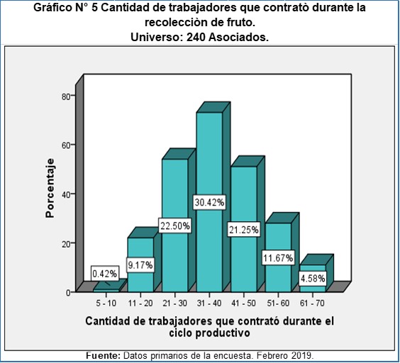 La mayoría de los asociados tienen una mayor cantidad de manzana de café por tanto habrá una contratación de mano de obra al momento de su recolecta (Ver gráfica No.5). También se pudo observar que una parte de los asociados no necesitan de mucho personal porque sus fincas son pequeñas, un factor que incide es los bajos precios que le pagan a los cortadores.