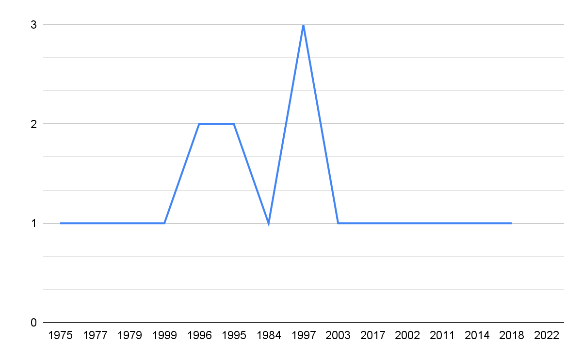En la figura 2 se puede observar cómo los trabajos con la palabra clave algorithm han destacado con un 42% del total, seguido de reversals cuyo punto más alto se mantuvo en los años 90.