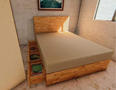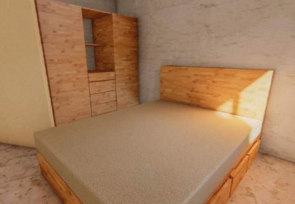 Regarding the bedroom design, we propose a headboard with a sliding compartment and a shelf that serves as a bureau; and in the lateral parts of the base, there are drawers for storing objects. See figures 8 and 9.
