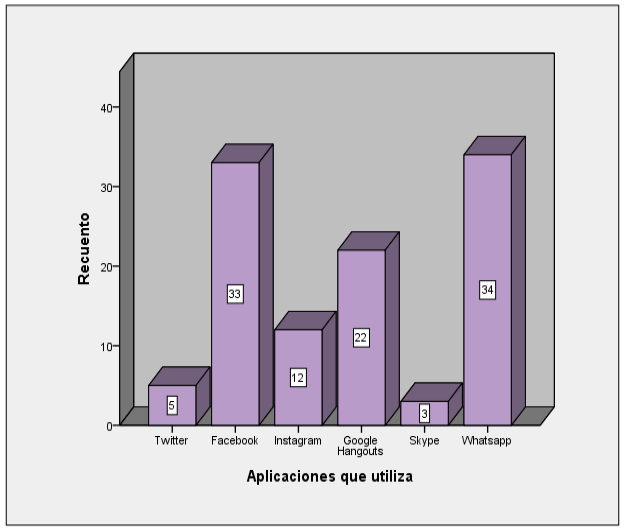 Las tres aplicaciones tecnológicas más usadas por los estudiantes las cuales son: WhatsApp en primer lugar, seguida por Facebook y Google Hangouts, esta última propuesta en esta tesis como el recurso tecnológico a utilizar lo cual muestra que los estudiantes están familiarizados con dicha aplicación.